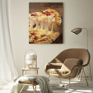 Quadro su vetro - Pizza con formaggio filante, pomodori e prosciutto su fondo di legno - 50x70cm - Capolavoro di arte italiana - Decorazione murale moderna per soggiorno e camera da letto ARTTOR