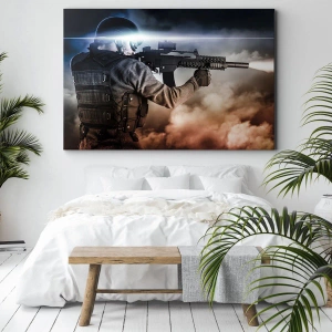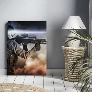 Quadro su tela - Stampe su Tela - Un soldato in azione con un fucile su uno sfondo di nuvole e luci. - 50x70cm - Semplicemente un eroe - Decorazione murale moderna per soggiorno e camera da letto ARTTOR