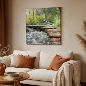 Il dipinto su tela "Sopra una cascata spumeggiante" raffigura un incantevole paesaggio boschivo con un ponte di legno su un ruscello impetuoso. L'acqua scorre dinamicamente sotto la struttura, creando un effetto di bellezza naturale e pace. Gli alberi verdi e la vegetazione circostanti conferiscono al paesaggio freschezza e armonia.