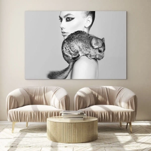- Il dipinto su vetro 70x50 cm raffigura un ritratto in bianco e nero di una donna con un cincillà. Questa elegante decorazione aggiunge eleganza e un tocco artistico unico a qualsiasi interno.