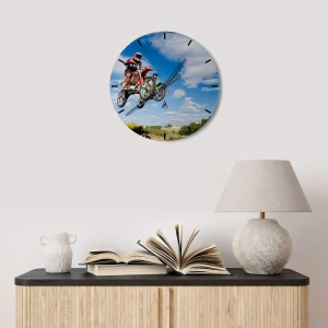 "Sky Jump" è un orologio da parete unico con un motivo dinamico di una motocross in volo contro il cielo blu. È un'immagine piena di energia e movimento, che conferisce dinamismo e un'atmosfera sportiva unica all'interno.