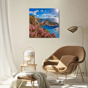 - Un orologio da parete con vista sulle scogliere greche, sul mare blu e sugli arbusti in fiore, perfetto per gli amanti dei ricordi delle vacanze e dei paesaggi meravigliosi.
