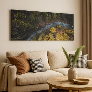 - Questa fotografia mostra una vista dall'alto di una foresta e di un fiume sinuoso. È l'aggiunta perfetta per interni che valorizzano i motivi naturali e l'armonia con la natura.