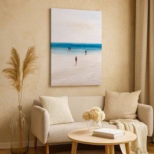 La stampa su tela "Natural Need" raffigura un pittoresco paesaggio di spiaggia con persone che camminano sulla sabbia, sullo sfondo delle calme acque del mare. La composizione è caratterizzata da colori tenui, dominati dalle tonalità turchesi e blu dell'acqua, in delicato contrasto con i colori chiari della sabbia. L'insieme crea una scena armoniosa e rilassante che porta un'atmosfera di pace vacanziera all'interno.
