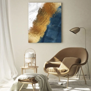- Una composizione astratta dominata da pennellate dorate su uno sfondo blu navy e bianco. Il dipinto emana calore, leggerezza ed eleganza, ravvivando perfettamente qualsiasi spazio interno in stile moderno.