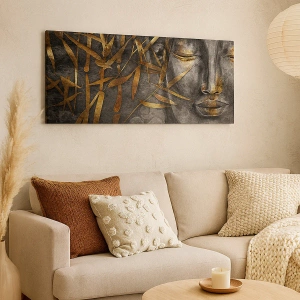 - Il dipinto raffigura un'immagine del Buddha circondata da bambù dorati su uno sfondo scuro. Si adatta perfettamente all'atmosfera Zen e alla spiritualità, infondendo armonia e pace negli interni.
