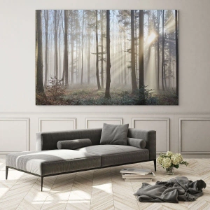 Quadro su vetro - Una foresta in una leggera nebbia con raggi di sole che brillano attraverso gli alberi - 80x120cm - Anche la nebbia si è svegliata - Decorazione murale moderna per soggiorno e camera da letto ARTTOR