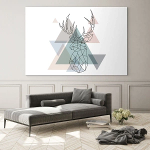 Quadro su vetro - Disegno geometrico di un cervo su uno sfondo di triangoli pastello - 70x50cm - Nel bosco geometrico - Decorazione murale moderna per soggiorno e camera da letto ARTTOR