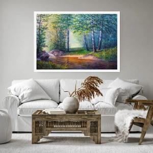 Poster - Un ruscello nella foresta circondato da betulle e sole - 100x70cm - Scena di beatitudine - Decorazione murale moderna per soggiorno e camera da letto ARTTOR
