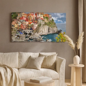 Quadro su tela - Stampe su Tela - Case colorate su una scogliera a picco sul mare nelle Cinque Terre - 50x70cm - Aggrappate alla roccia - Decorazione murale moderna per soggiorno e camera da letto ARTTOR