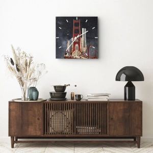 La disposizione dinamica degli elementi sul quadrante dell'orologio trasmette l'impressione di movimento e vita cittadina. Le luci intense dei lampioni e delle auto contrastano con il cielo scuro e stellato, creando una composizione piena di energia ed espressione moderna. Questa combinazione si adatta perfettamente a uffici, soggiorni e interni in stile industriale e urbano. Il motivo del ponte introduce il simbolismo della connessione degli spazi, dell'attraversamento dei confini e della comunicazione.