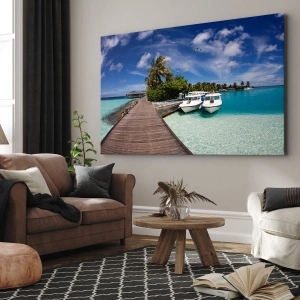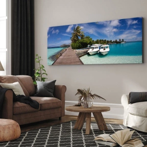 Quadro su tela - Stampe su Tela - Un molo su un mare turchese con barche e palme - 120x50cm - Il paradiso esiste davvero - Decorazione murale moderna per soggiorno e camera da letto ARTTOR