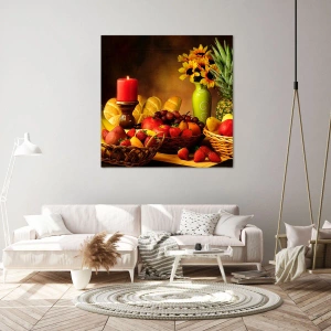 Quadro su tela - Stampe su Tela - Natura morta con frutta, pane, candela e fiori - 160x50cm - Natura morta con pane e frutta - Decorazione murale moderna per soggiorno e camera da letto ARTTOR
