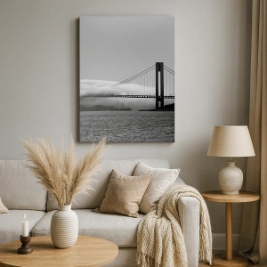 Quadro su tela - Stampe su Tela - Un ponte sull'acqua avvolto nella nebbia in uno scatto in bianco e nero - 160x50cm - Navigare attraverso la Porta d'Oro - Decorazione murale moderna per soggiorno e camera da letto ARTTOR