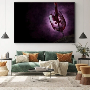 Quadro su tela - Stampe su Tela - Vino rosso versato in un bicchiere su uno sfondo di fumo viola - 120x50cm - Scarlatto? Carminio? No, rubino - Decorazione murale moderna per soggiorno e camera da letto ARTTOR