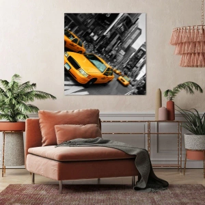 La stampa su tela "Taxi gialli a New York" raffigura una scena dinamica della vita cittadina, dove i taxi gialli attraversano un incrocio trafficato. Il colore giallo intenso dei veicoli contrasta perfettamente con lo sfondo monocromatico, attirando l'attenzione e conferendo all'immagine un'energia straordinaria.