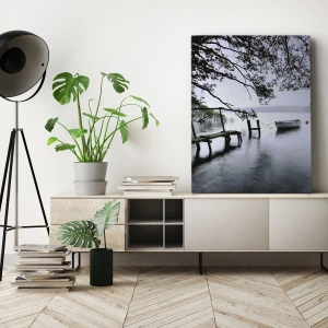 Quadro su tela - Stampe su Tela - Un molo sull'acqua con una barca sullo sfondo circondata da un paesaggio nebbioso - 120x80cm - E già ti riposi - Decorazione murale moderna per soggiorno e camera da letto ARTTOR