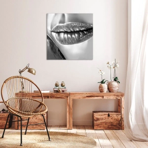 Quadro su tela - Stampe su Tela - Primo piano in bianco e nero delle labbra di una donna con effetto lucido e dettagli. - 70x50cm - So quello che pensi - Decorazione murale moderna per soggiorno e camera da letto ARTTOR