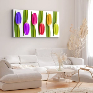 Quadro su tela - Stampe su Tela - Tulipani multicolori disposti in fila su uno sfondo bianco - 120x50cm - Composizione arcobaleno - Decorazione murale moderna per soggiorno e camera da letto ARTTOR