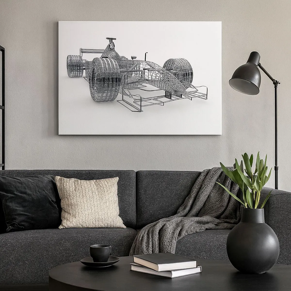 - Uno schizzo di un'auto da corsa su uno sfondo chiaro, che ne enfatizza l'estetica e la dinamicità. Una decorazione perfetta per gli appassionati di tecnologia e automobilismo.