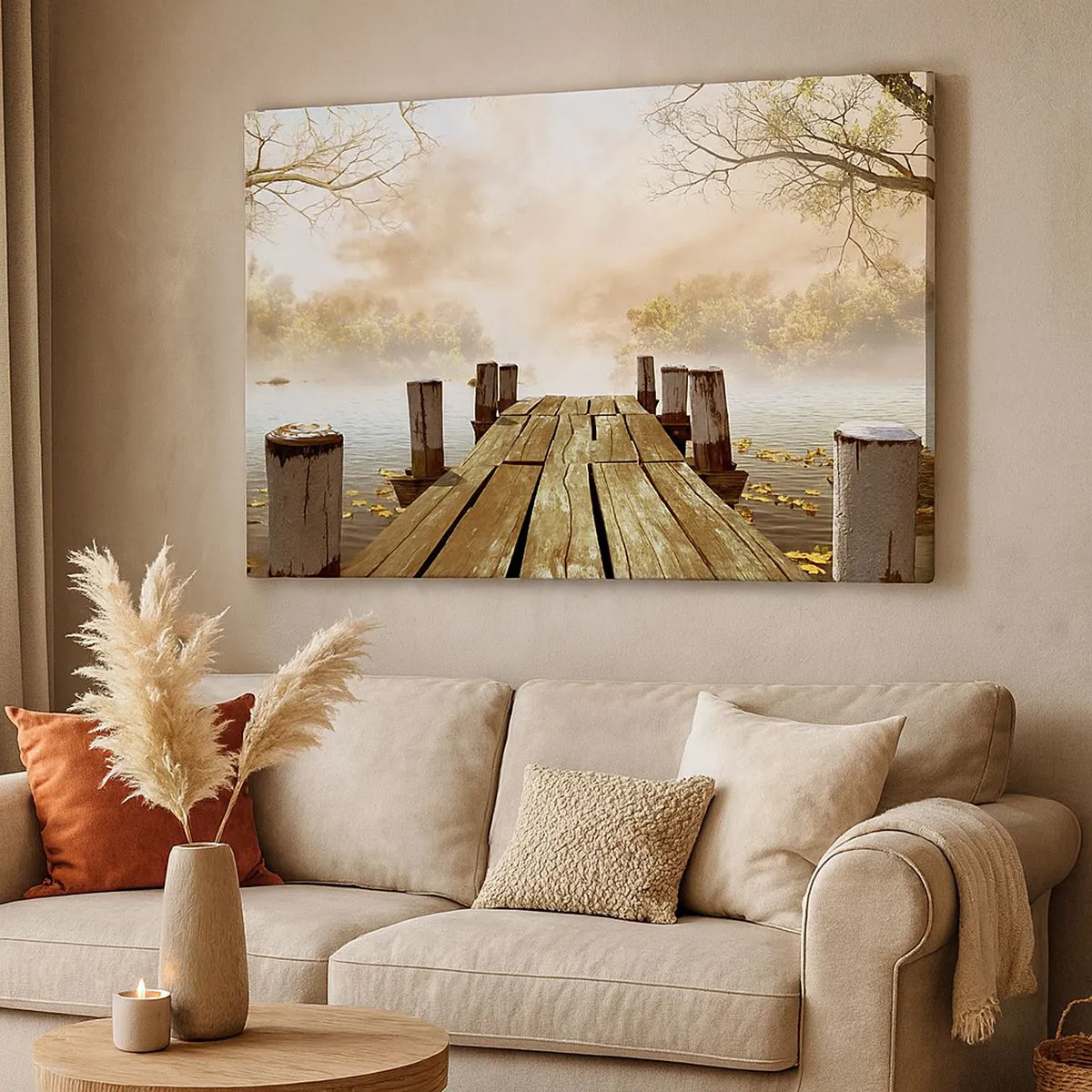 Quadro su tela - Stampe su Tela - Un molo di legno che conduce a un lago calmo nella nebbia mattutina - 120x80cm - La mite melanconia autunnale - Decorazione murale moderna per soggiorno e camera da letto ARTTOR