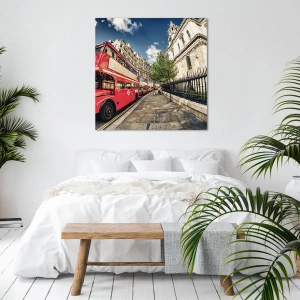 Quadro su tela - Stampe su Tela - Autobus rosso a due piani a Londra vicino alla strada e alla cattedrale - 140x50cm - Via di Londra in grigio e rosso - Decorazione murale moderna per soggiorno e camera da letto ARTTOR
