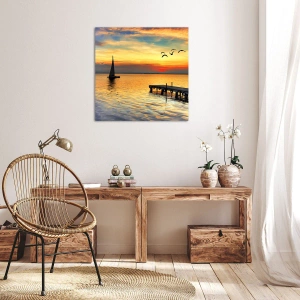 Quadro su tela - Stampe su Tela - Tramonto con barca a vela e molo su un lago calmo - 120x50cm - Il ritorno alla sera - Decorazione murale moderna per soggiorno e camera da letto ARTTOR