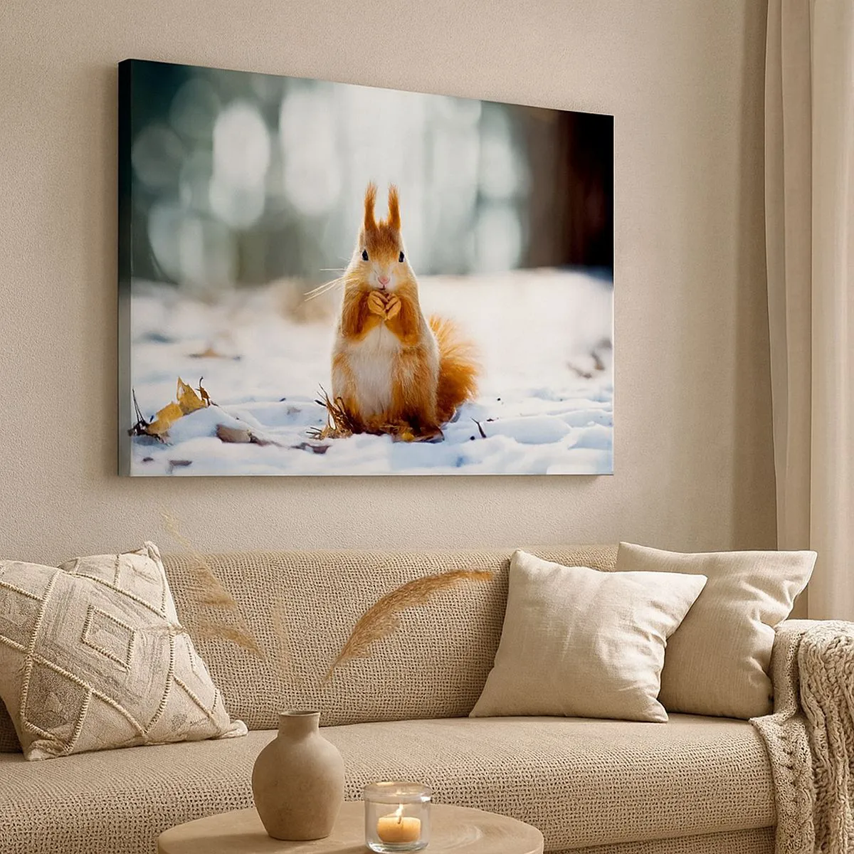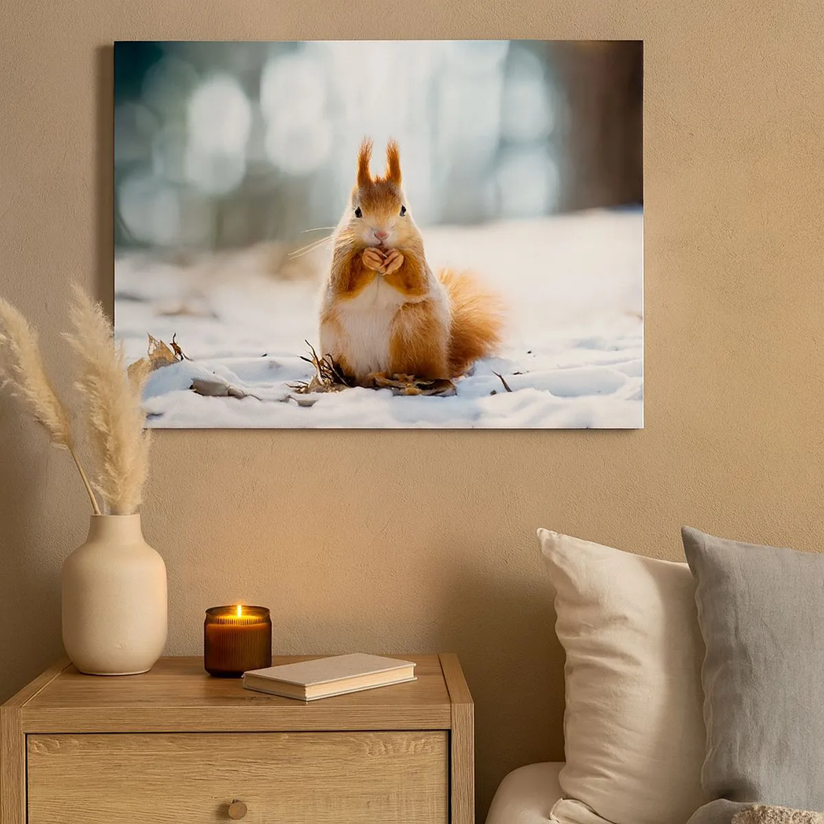 - Una pittoresca scena invernale che raffigura uno scoiattolo sullo sfondo di una foresta innevata, perfetta per interni ricchi di fascino e natura.