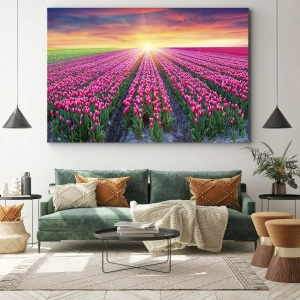 Quadro su tela - Stampe su Tela - Un campo di tulipani al tramonto - 160x50cm - La fattoria della bellezza - Decorazione murale moderna per soggiorno e camera da letto ARTTOR