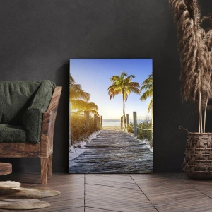 Stampa artistica su tela "Sentiero in legno sulla spiaggia con palme sullo sfondo" è una decorazione unica che ci trasporta in un'atmosfera tropicale piena di pace e armonia. Il motivo centrale è un sentiero in legno che conduce attraverso le dune alla spiaggia, circondato da palme illuminate dalla calda luce del sole. Questo scenario cattura l'atmosfera estiva, incoraggiando il relax e il sogno.