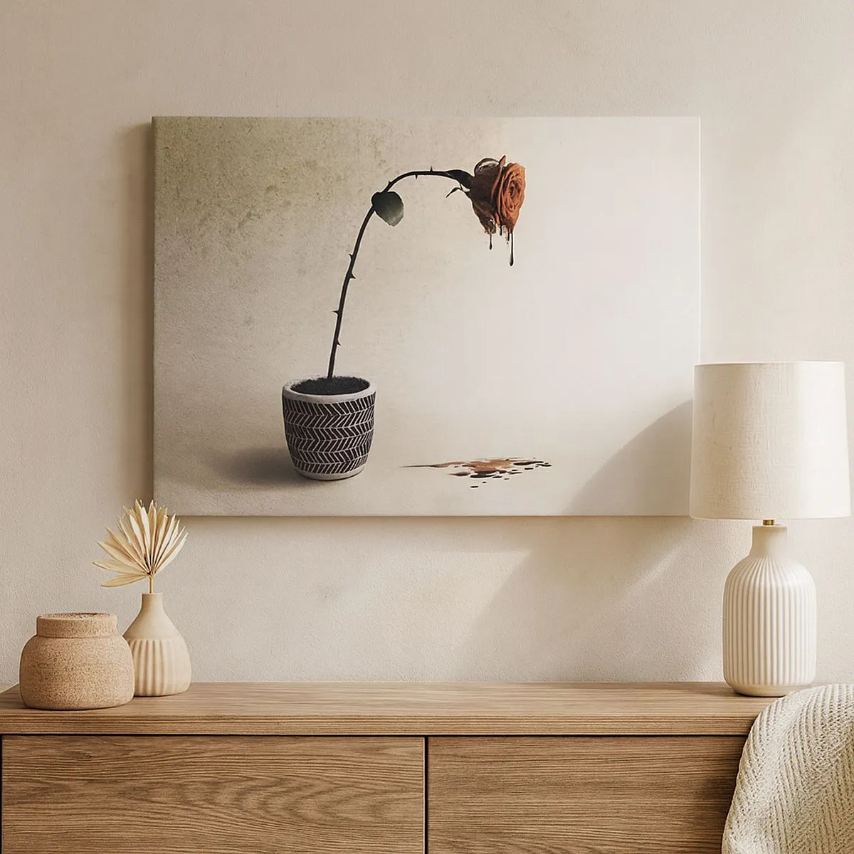 "Rosa dolorosa" è un dipinto artistico su tela di 70x50 cm, raffigurante una rosa rossa in un vaso decorativo su uno sfondo chiaro. La rosa con lo stelo leggermente ricurvo simboleggia la caducità della bellezza, mentre le gocce di tintura che sgocciolano sulla superficie aggiungono drammaticità e profondità.