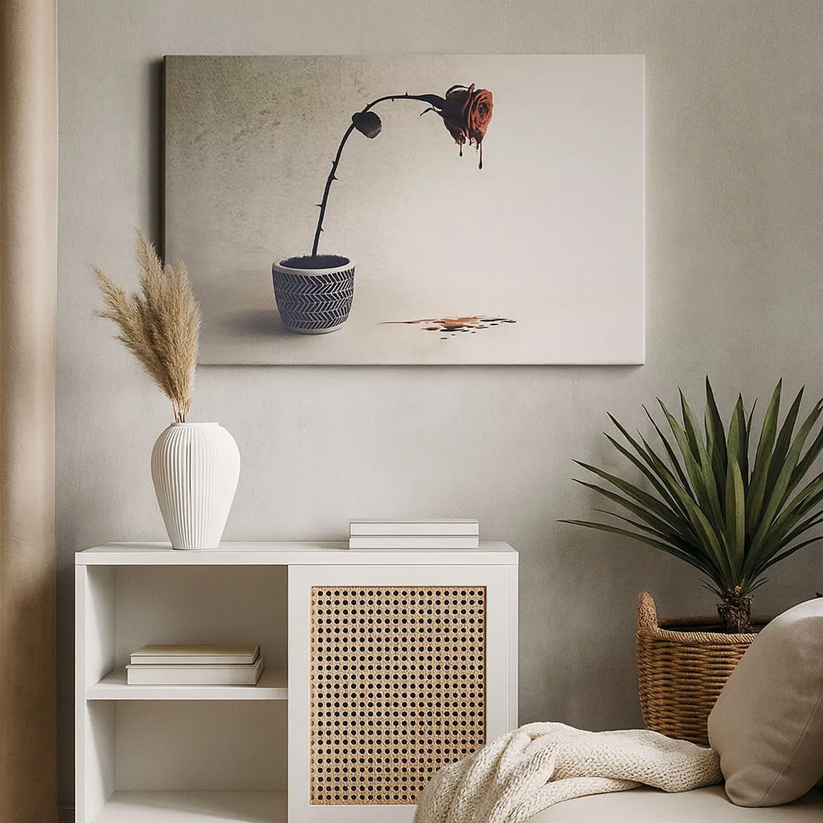 Quadro murale - Rosa dolorosa - Rosa rossa in vaso con gocce di tintura su sfondo bianco