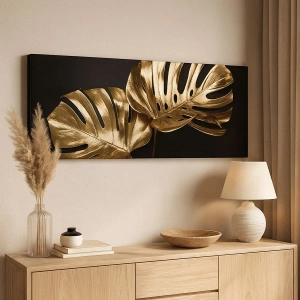 Quadro su tela - Stampe su Tela - Foglie di monstera dorate su sfondo nero - 70x50cm - I tesori della natura - Decorazione murale moderna per soggiorno e camera da letto ARTTOR