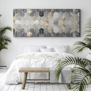 - Un'elegante stampa su tela con motivo geometrico esagonale nei toni dell'oro, del grigio e del beige. Una scelta ideale per interni moderni ed eleganti.