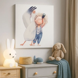 - Questa graziosa stampa su tela 70x50 cm raffigura un bambino con un pellicano e un telescopio. È un'aggiunta perfetta alla cameretta di un bambino, portando calore e gioia.