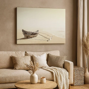 - Questo dipinto raffigura una vecchia barca da pesca su una spiaggia sabbiosa. Una decorazione murale minimalista che dona armonia e nostalgia a qualsiasi interno.
