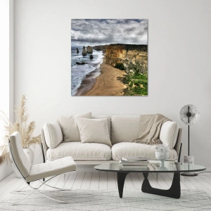 Quadro su vetro - Scogliere che si affacciano sull'oceano e sulla spiaggia sotto un cielo nuvoloso - 100x70cm - Bellezza selvatica - Decorazione murale moderna per soggiorno e camera da letto ARTTOR