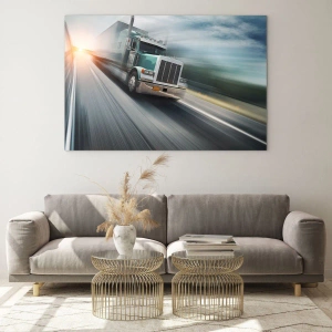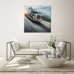 Quadro su vetro - Camion in autostrada al tramonto - 100x70cm - Gigante americano in corsa - Decorazione murale moderna per soggiorno e camera da letto ARTTOR