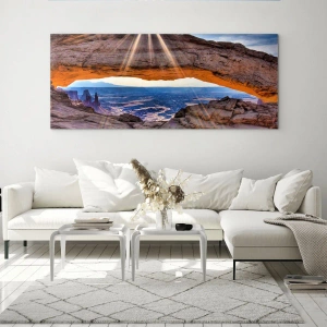 Quadro su vetro - Arco di roccia con raggi di sole sullo sfondo del paesaggio - 50x70cm - Attraverso il portale di roccia - Decorazione murale moderna per soggiorno e camera da letto ARTTOR