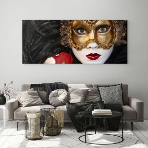 Il quadro in vetro Maschera di Carnevale con Rosa Rossa è un'opera unica che unisce elementi di eleganza e mistero in un'unica composizione. In primo piano si trova una maschera di Carnevale dorata decorata con dettagli intricati, e nella sua mano tiene una rosa rossa. Il contrasto tra l'oro della maschera e il rosso intenso della rosa crea un accento distintivo che attira l'attenzione e conferisce al quadro un carattere unico.