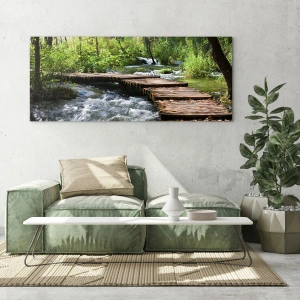 Quadro su vetro - Un ponte di legno sopra un ruscello impetuoso, circondato dal verde della foresta. - 80x120cm - Sulla cascata spumeggiante - Decorazione murale moderna per soggiorno e camera da letto ARTTOR