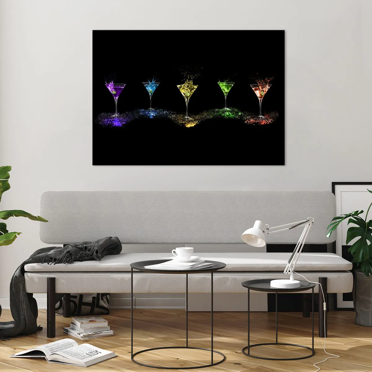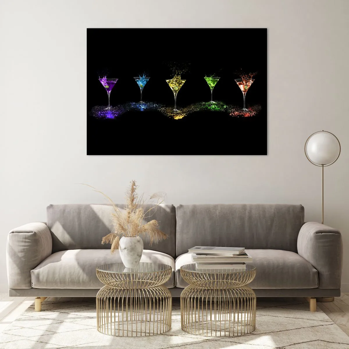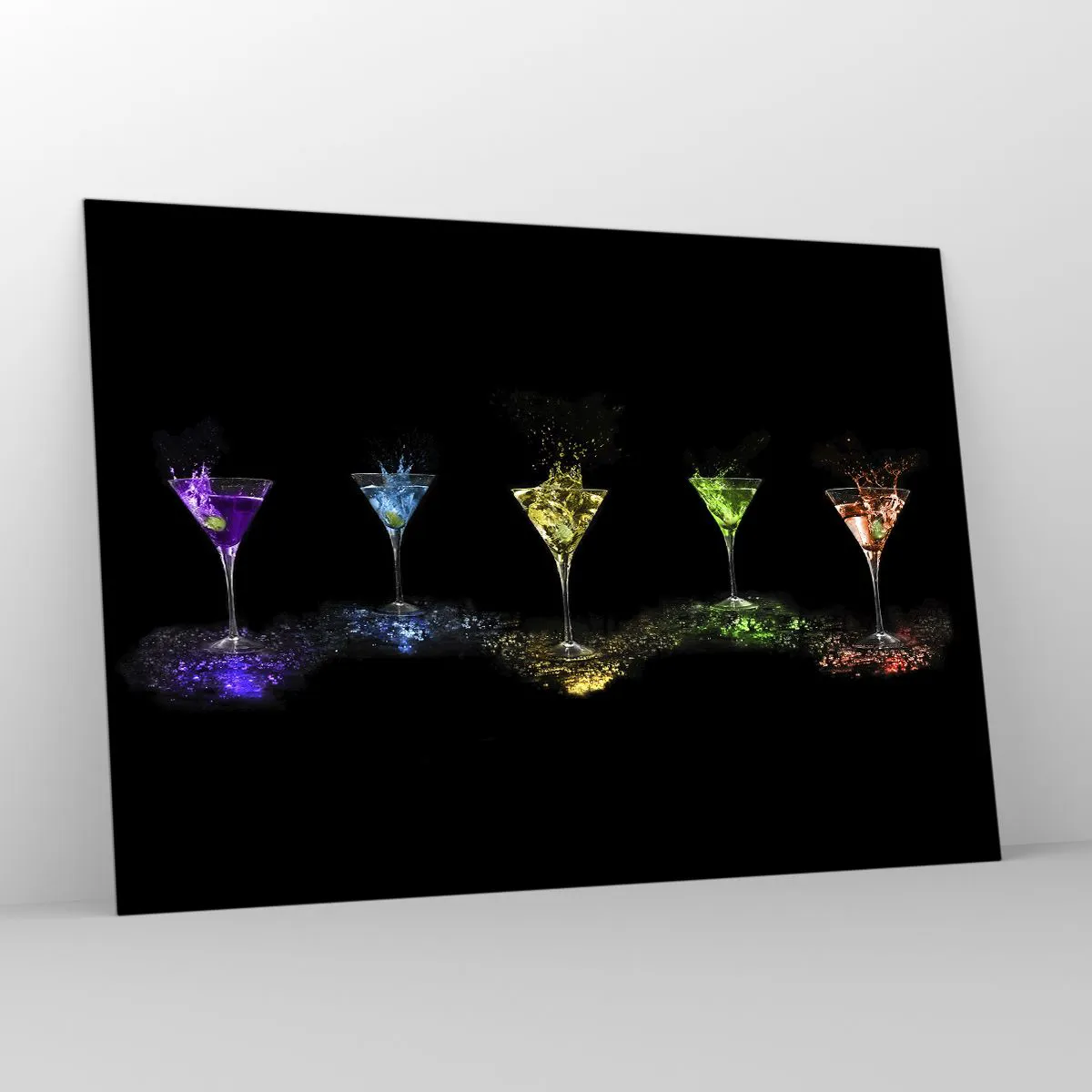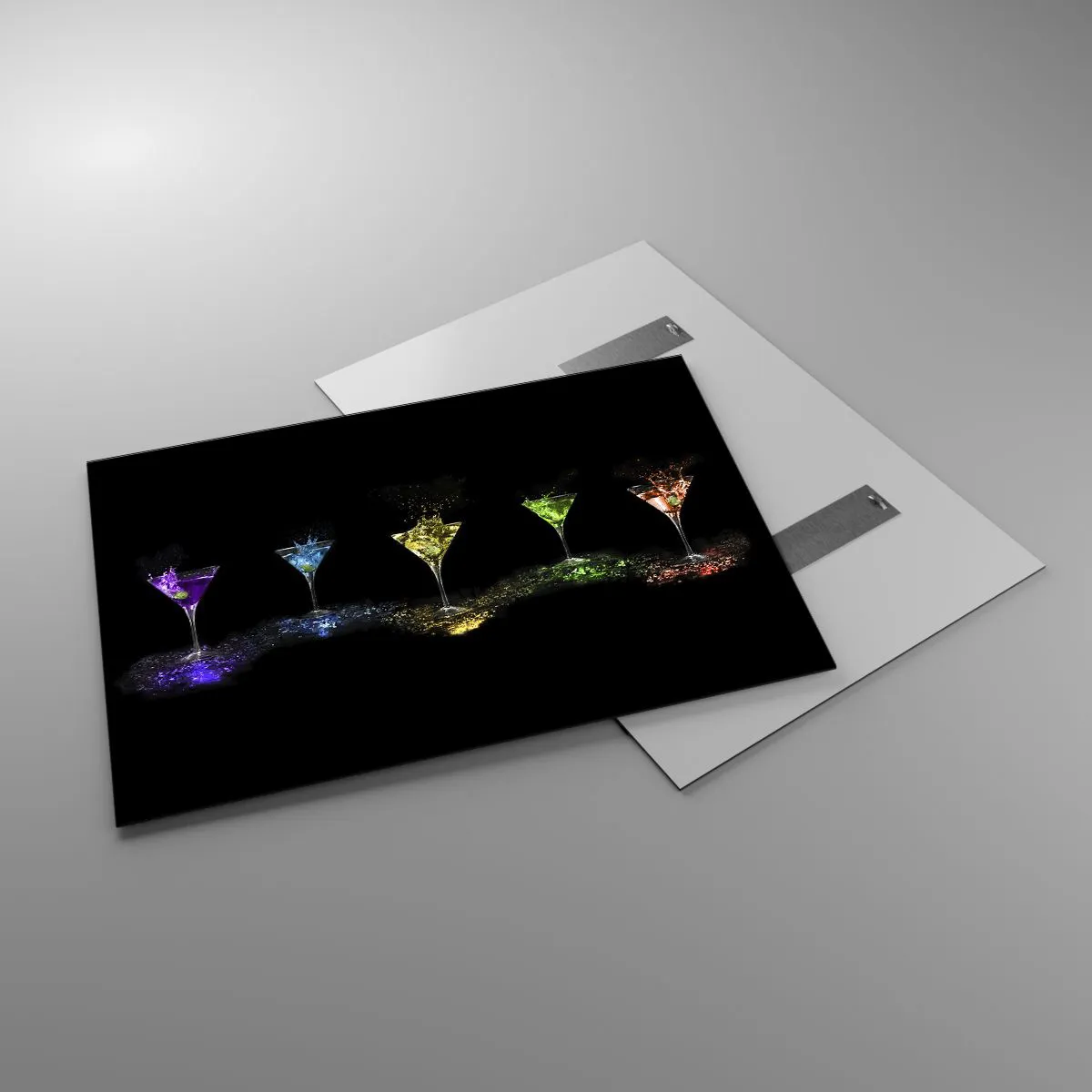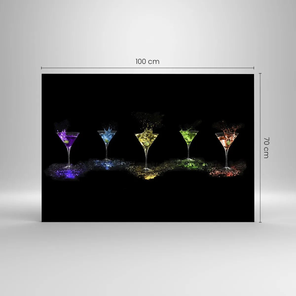 Quadro su vetro - Bevande colorate in bicchieri su sfondo nero - 100x70cm - I colori della gioia nel mondo dei cristalli - Decorazione murale moderna per soggiorno e camera da letto ARTTOR