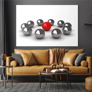Quadro su vetro - Una palla rossa circondata dall'argento su uno sfondo bianco - 50x70cm - Cerchio in argento e rosso - Decorazione murale moderna per soggiorno e camera da letto ARTTOR