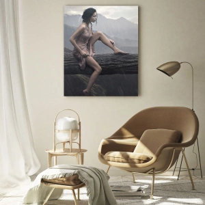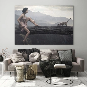 Quadro su vetro - Una donna e un gatto su un tronco di legno in un paesaggio piovoso - 50x70cm - Cime di bellezza - Decorazione murale moderna per soggiorno e camera da letto ARTTOR
