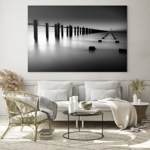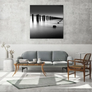 Quadro su vetro - Un molo minimalista in bianco e nero su acque calme - 50x70cm - Lontananza grigia nella nebbia - Decorazione murale moderna per soggiorno e camera da letto ARTTOR