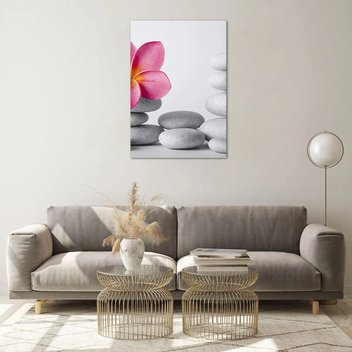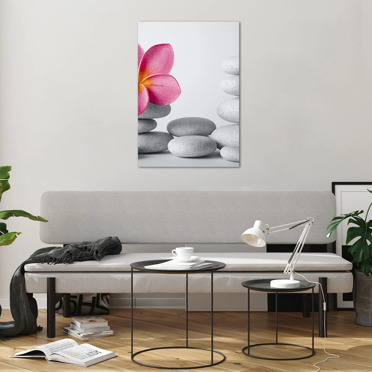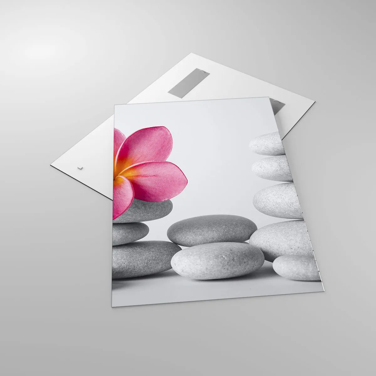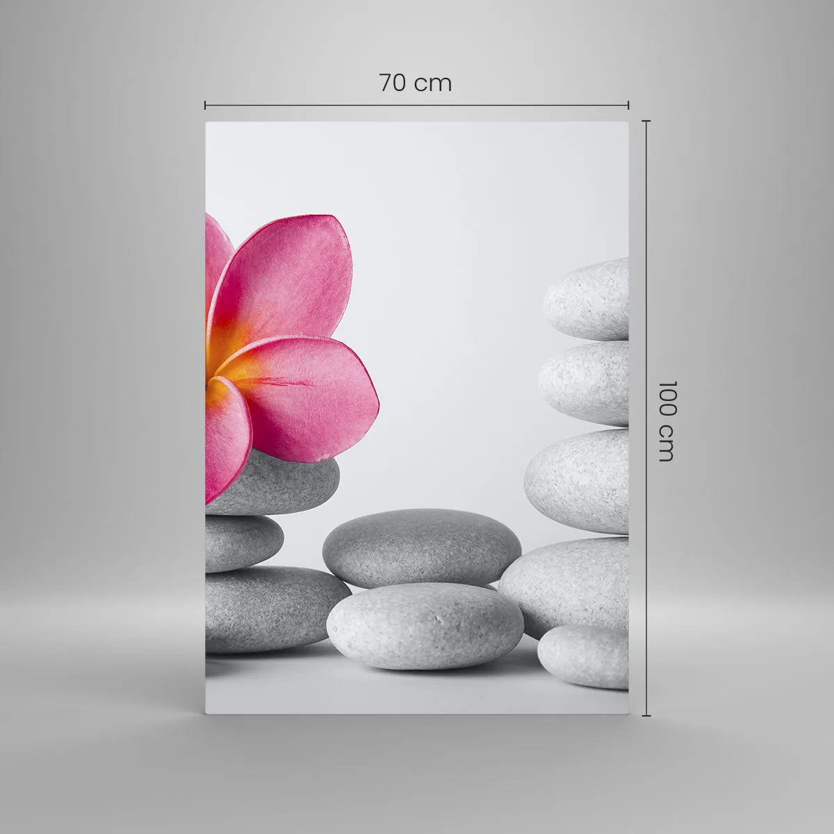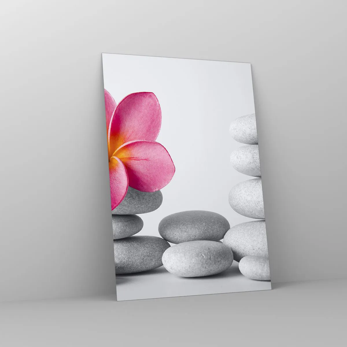 Quadro su vetro - Fiore rosa su pietre in stile zen - 70x100cm - Pietra su pietra, e su questa pietra... - Decorazione murale moderna per soggiorno e camera da letto ARTTOR