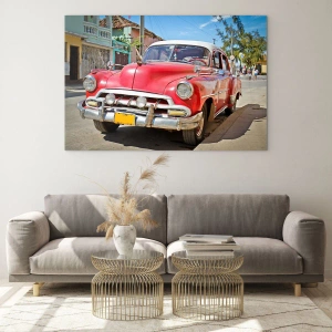 Quadro su vetro - Auto d'epoca rossa su una strada cittadina - 120x80cm - Ancora solamente a Cuba - Decorazione murale moderna per soggiorno e camera da letto ARTTOR