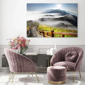 Quadro su vetro - Paesaggio montano con nebbia e sentiero in legno all'alba - 50x70cm - Avvolti di luce e nebbia - Decorazione murale moderna per soggiorno e camera da letto ARTTOR
