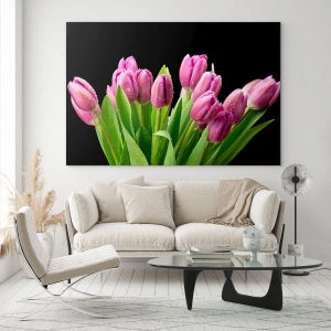 La stampa artistica su vetro "Lilac Joy of Spring" raffigura un bouquet di delicati tulipani rosa ricoperti di gocce d'acqua, che ne enfatizzano la freschezza e il fascino naturale. L'intera composizione risalta sullo sfondo nero, conferendo all'immagine eleganza ed espressività. Questo motivo unico si adatta perfettamente agli interni moderni e minimalisti.