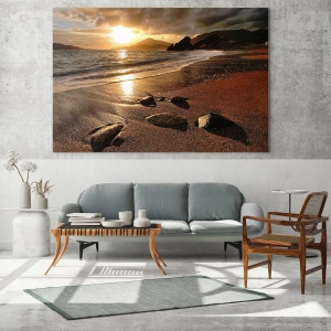 Quadro su vetro - Spiaggia al tramonto con pietre sulla riva - 140x50cm - Seguendo il sole verso le colline - Decorazione murale moderna per soggiorno e camera da letto ARTTOR